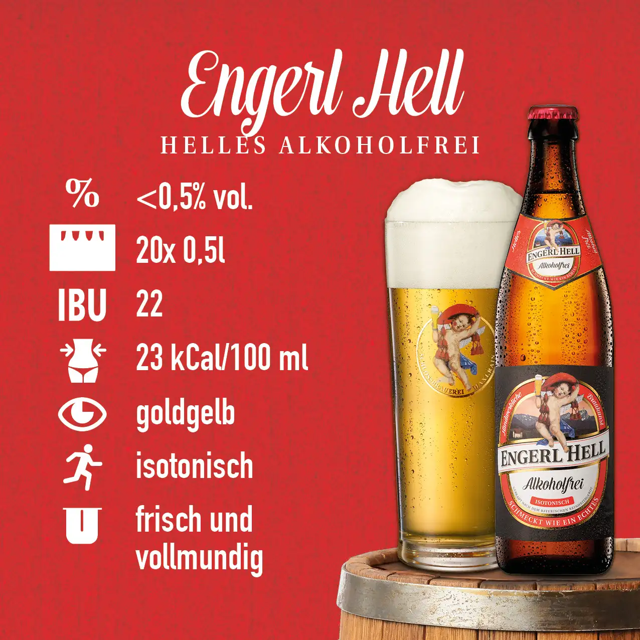Unser Engerl Hell ist ideal für all jene, die auf Alkohol verzichten wollen oder müssen, nicht aber auf echten Biergeschmack: Dieses alkoholfreie Bier ist ein natürlich erfrischender Durstlöscher mit vollmundigem Geschmack und mit nur 17kcal/100ml, für kalorienbewusste Biergenießer eine fantastische Alternative zu Limonaden oder Fruchtschorlen.