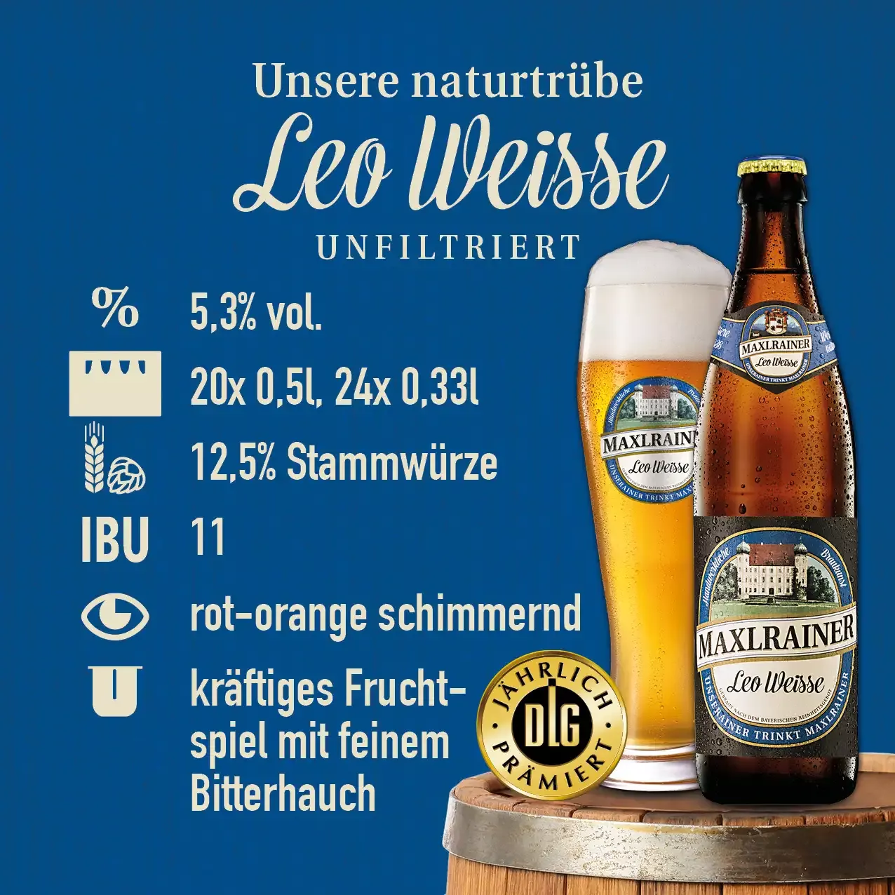 Die Maxlrainer Leo Weisse ist unser klassisches, helles Weißbier, das zu jeder Jahreszeit für höchsten bayerischen Weißbiergenuss steht. Ihren vollen und eigenen Charakter gewinnt sie durch die im Hause selbstgezogene obergärige Hefe. Schon beim Einschenken nimmt der Kenner das wunderbare Weißbieraroma wahr. Im Lagerkeller ausgereift, wird die Leo Weisse unfiltriert und kellertrüb abgefüllt.